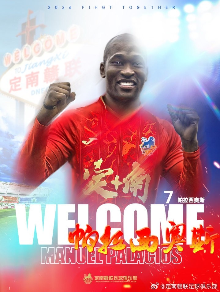 官方:33岁前蓉城外援帕拉西奥斯加盟定南赣联,将身穿7号球衣