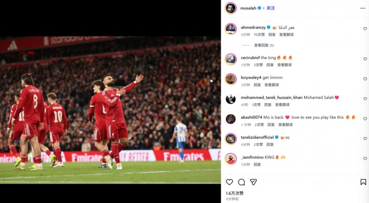 传射建功!萨拉赫社媒晒向球迷致意照,手抚胸前利物浦队徽