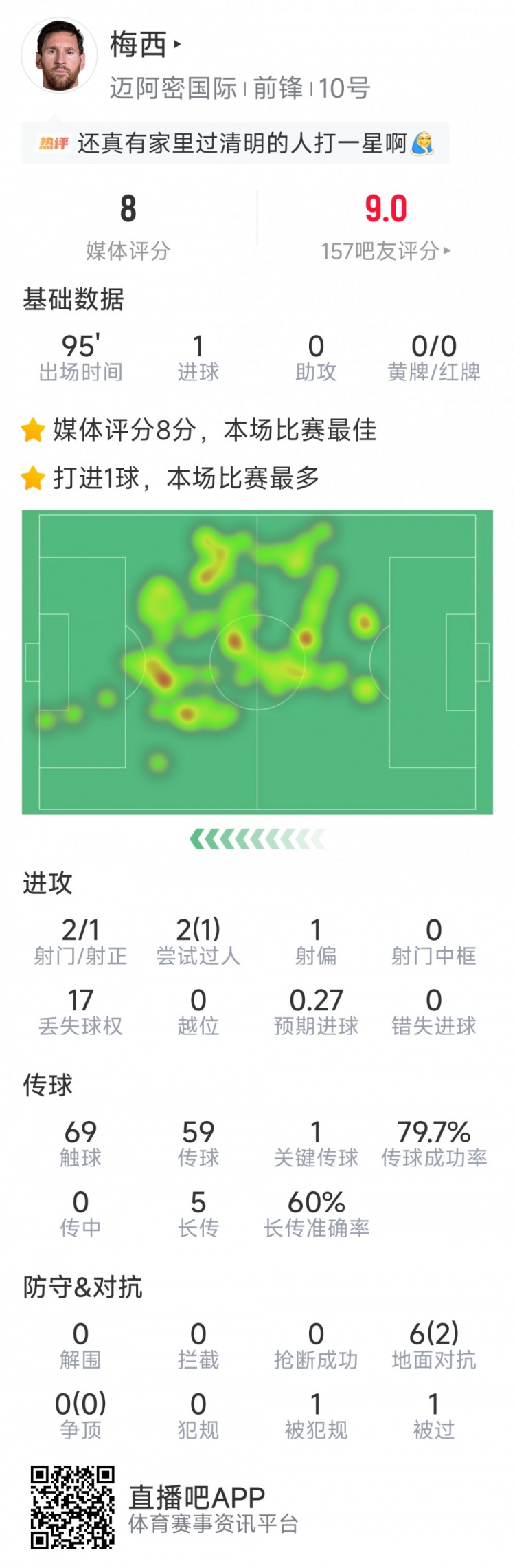 梅西本场数据:1粒进球,2射1正,1次关键传球,评分8分